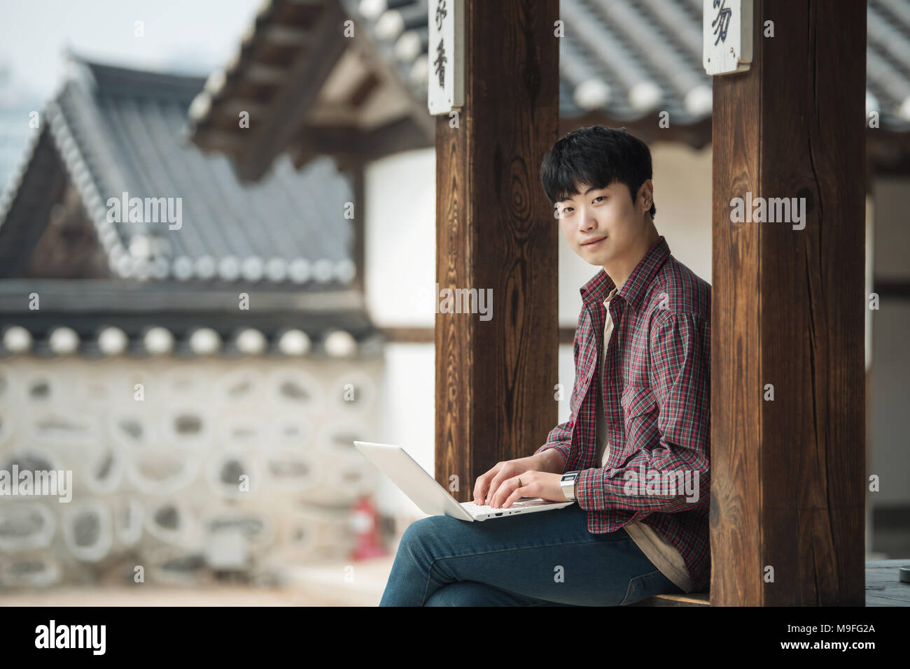 Young Man Traveling In South Korea Using A Laptop Sitting In A